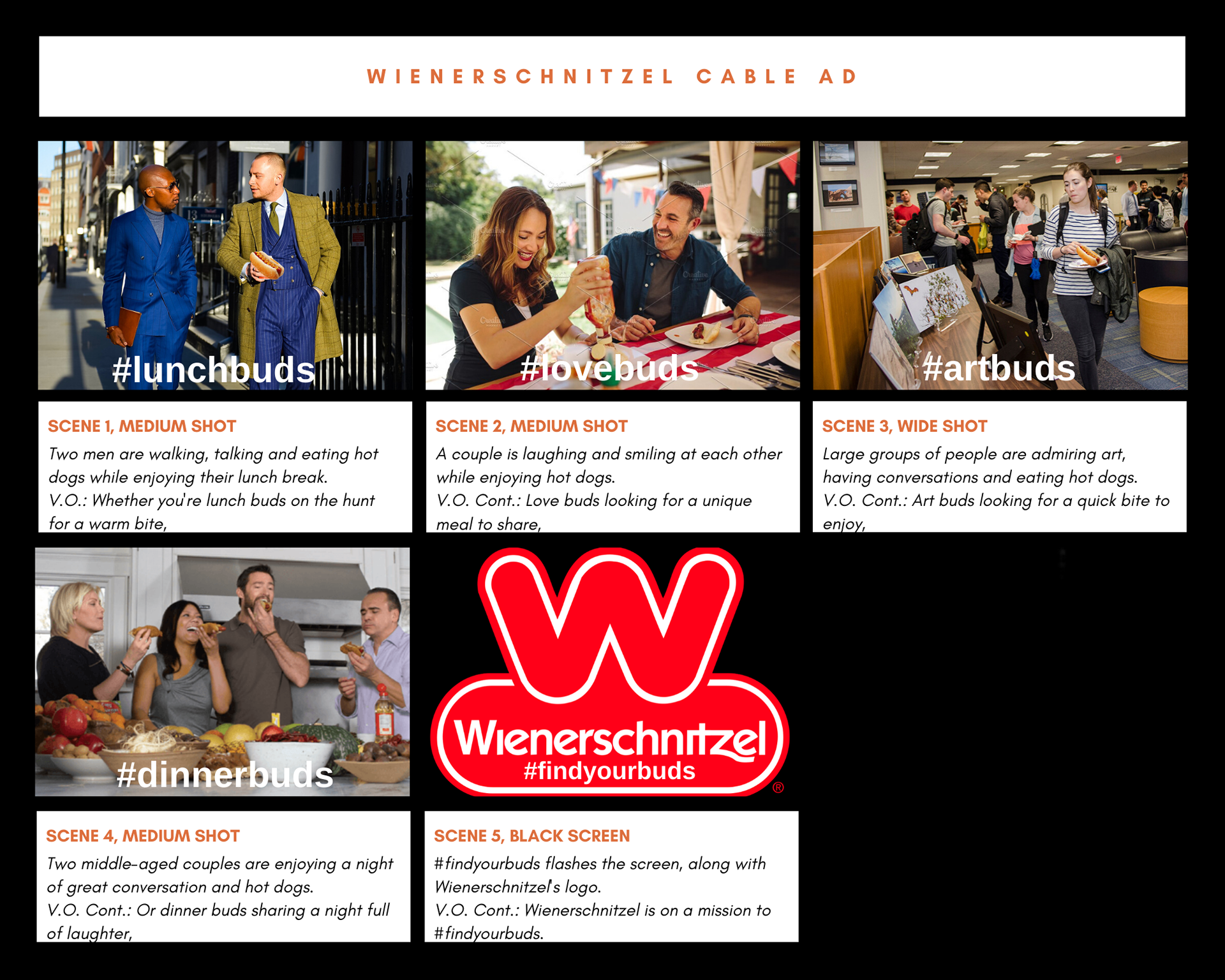 I wrote the script for our 20-second cable ad, then created the storyboard. After finalizing the script and storyboard, I cast every actor. I coordinated every aspect of each shoot, including scheduling, location scouting, and food styling. I directed the actors and co-director of photography to create unique and relatable shots. I filmed and adjusted lighting at various indoor and outdoor locations to ensure that we could avoid reshooting. Finally, I edited the ad to completion using Adobe Premiere Pro.